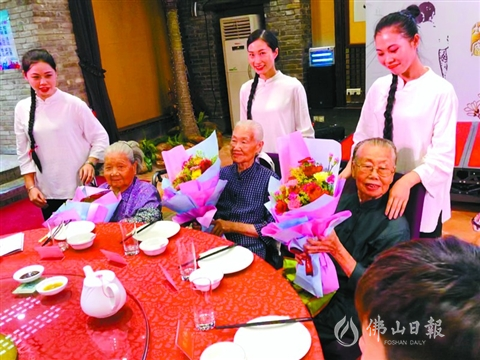 自梳女七夕文化节昨日在均安镇沙头古村举行,黄瑞云、欧阳叶欢、欧阳琼3位姑太(从左到右)品妈姐家宴。