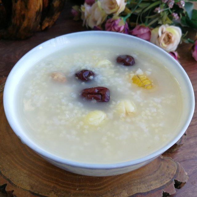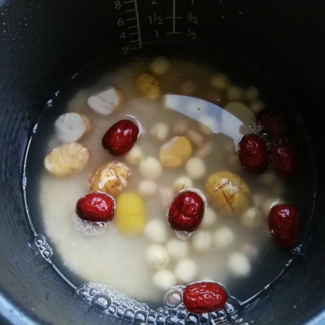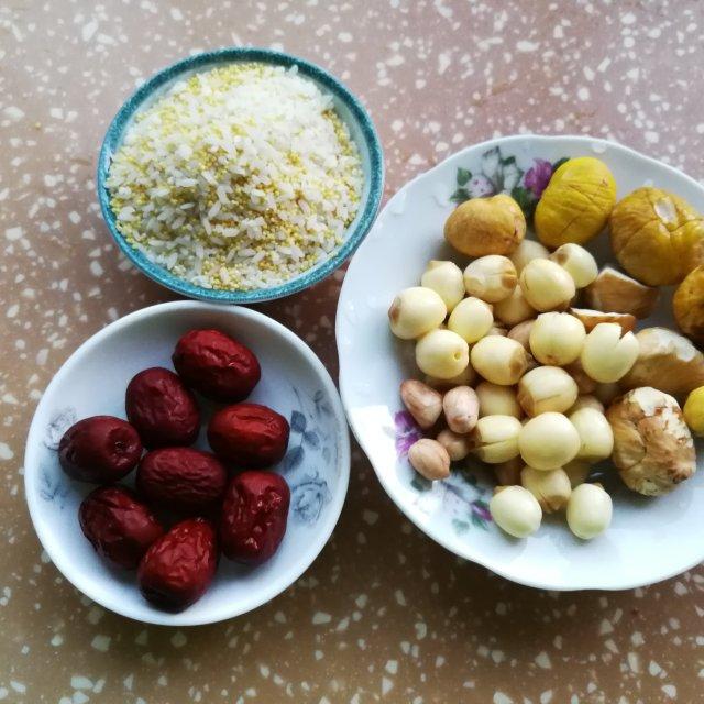材料:鲜莲子、板栗、红枣、大米、小米、花生。