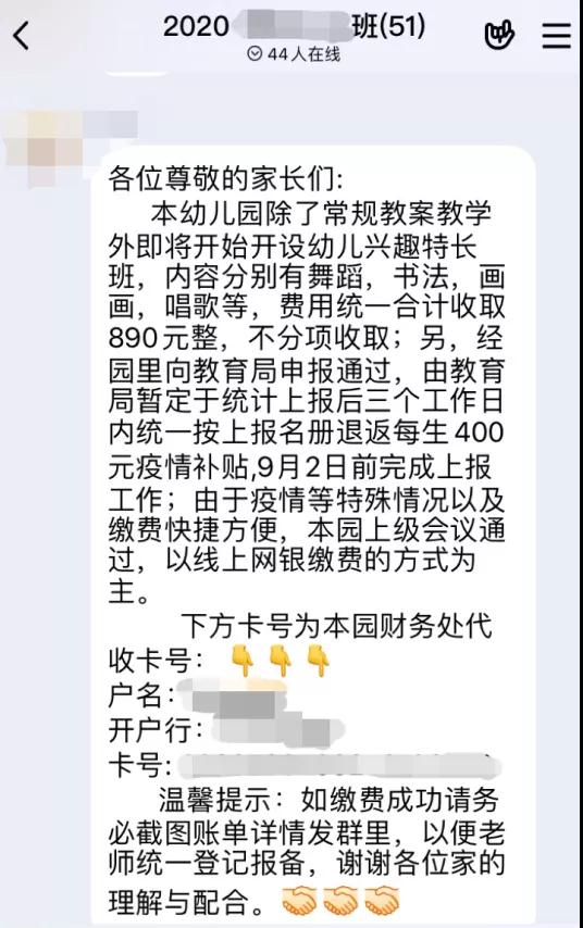 9月1日11时55分,三水的王女士在孩子的班级QQ群中,看到“班主任温老师”发布了一条信息,称幼儿园开设兴趣特长班需交890元费用,后会返还400元疫情补贴,且以线上网银缴费方式为主。