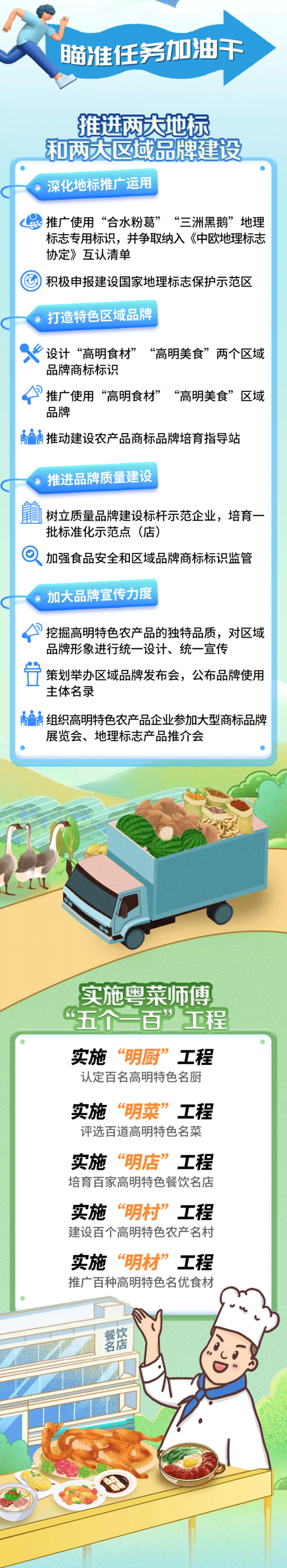 为此,高明区将重点实施三项重点任务,即推进两大地标和两大区域品牌建设、实施粤菜师傅“五个一百”工程、打造两大乡村特色优势产业集群。