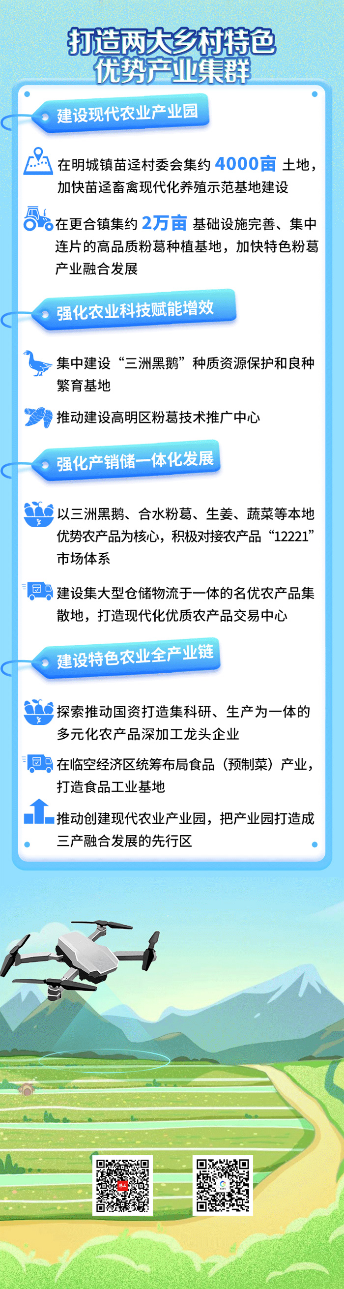 到2024年底,“合水粉葛”“三洲黑鹅”地理标志品牌、“高明食材”“高明美食”区域品牌知名度和价值显著提升,力争建成“合水粉葛”“三洲黑鹅”两大百亿级乡村特色优势产业集群。