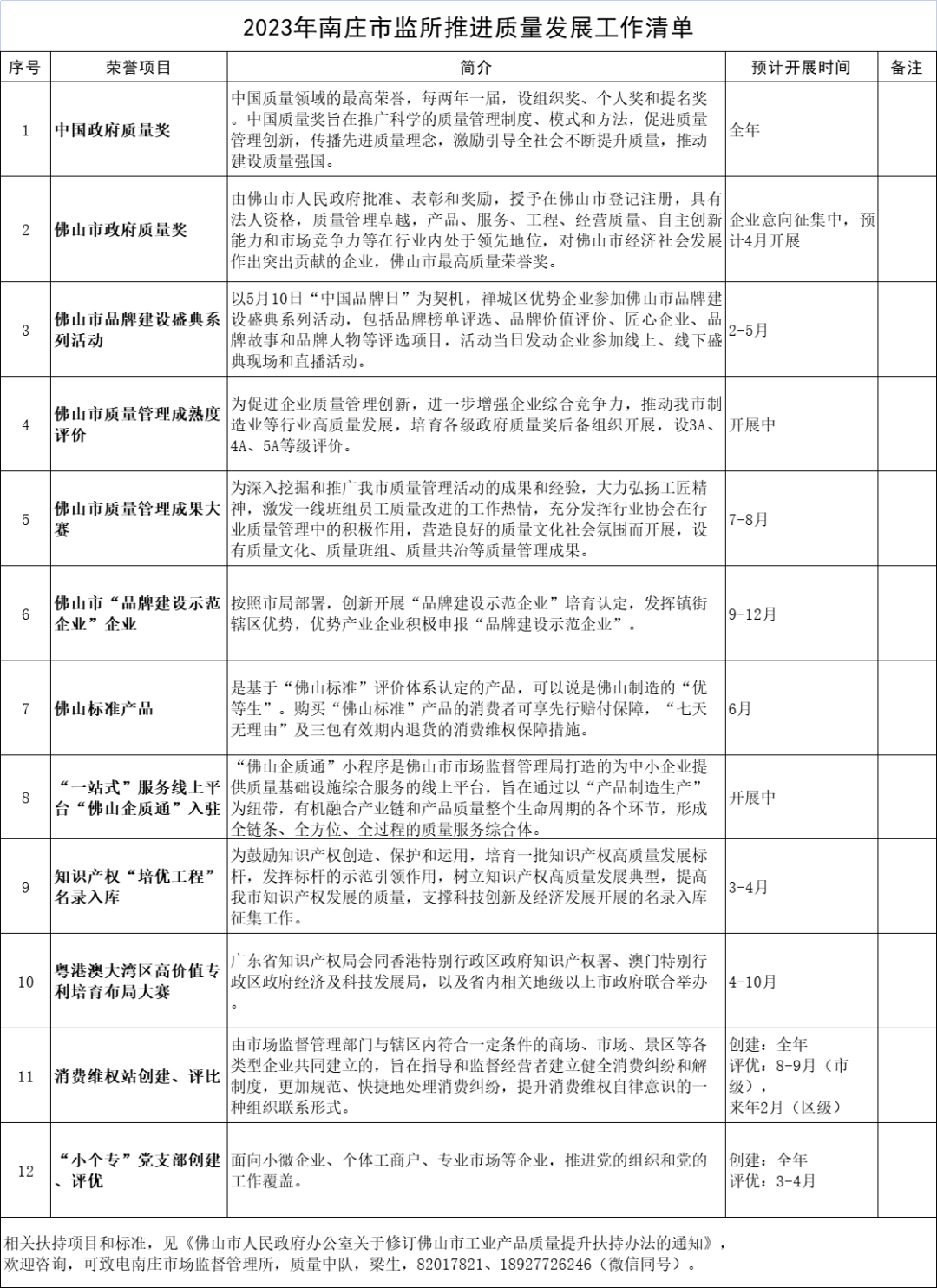 相关扶持项目和标准,见《佛山市人民政府办公室关于修订佛山市工业产品质量提升扶持办法的通知》,欢迎咨询,可致电南庄市场监督管理所,质量中队,梁生,82017821、18927726246(微信同号)。