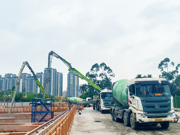 施工现场,两台泵车同时浇筑混凝土。