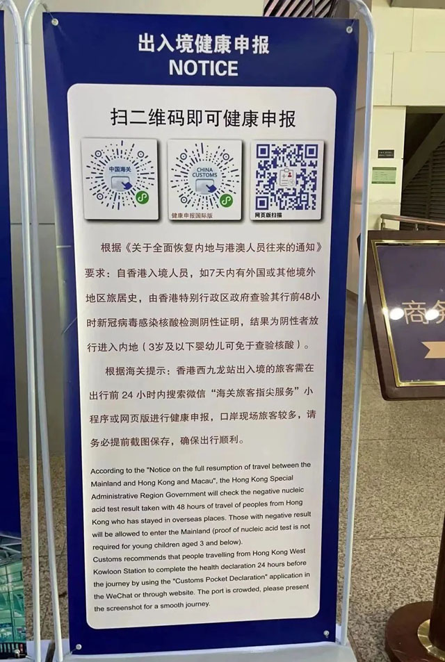 2月6日起,乘坐高铁列车往返内地、香港的旅客,不再需要持有48小时内核酸检测阴性证明。根据《关于全面恢复内地与港澳人员往来的通知》要求,自香港入境人员,如7天内有外国或其他境外地区旅居史,由香港特别行政区政府查验其行前48小时新冠病毒感染核酸检测阴性证明,结果为阴性者放行进入内地(3岁及以下婴幼儿可免于查验核酸)。