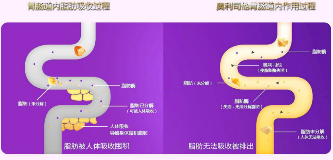 简单来说,就是阻止脂肪的水解,让脂肪从体内直接排泄出去,从而减少脂肪的摄入,以达到控制体重的效果。