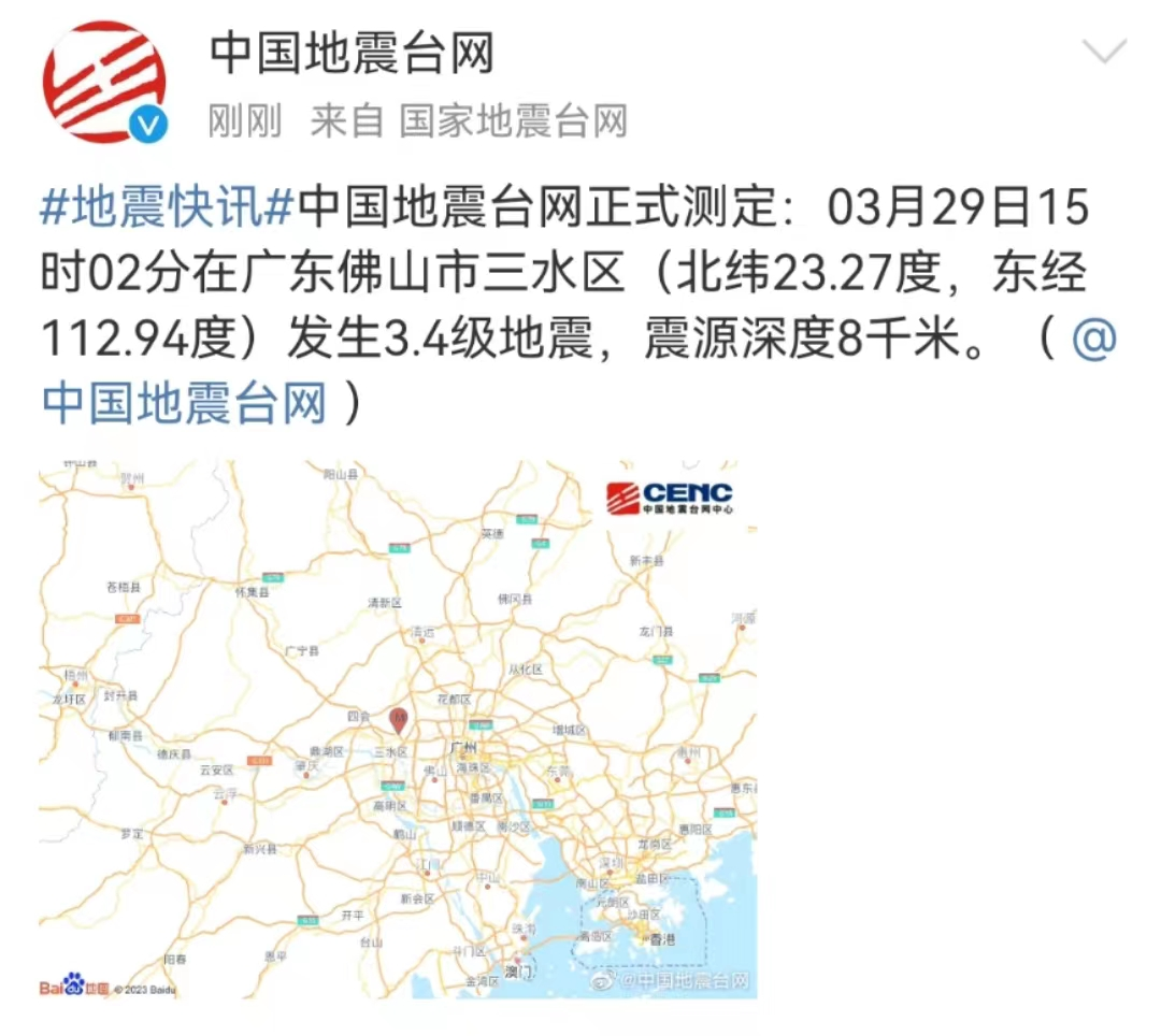 中国地震台网正式测定:03月29日15时02分在广东佛山市三水区(北纬23.27度,东经112.94度)发生3.4级地震,震源深度8千米。