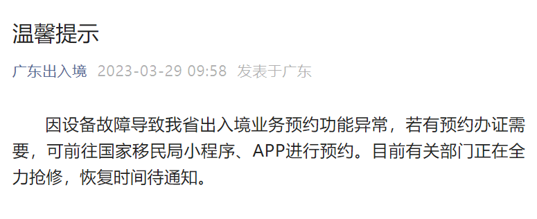 据“广东出入境”微信公众号今日(3月29日)消息,因设备故障导致广东省出入境业务预约功能异常,若有预约办证需要,可前往国家移民局小程序、APP进行预约。目前有关部门正在全力抢修,恢复时间待通知。