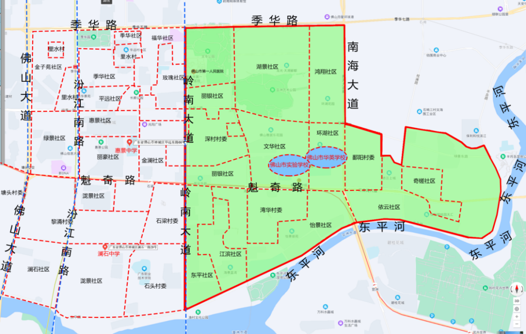 (一)面向禅城区户籍生招生517人,其中面向就近入学片区范围招生284人,面向全区(就近入学片区范围以外的禅城区户籍生)招生233人。面向就近入学片区范围是指学生本人的户籍地址在岭南大道以东、季华路以南与东平路围合的禅城区范围(如下图绿色区域所示)。