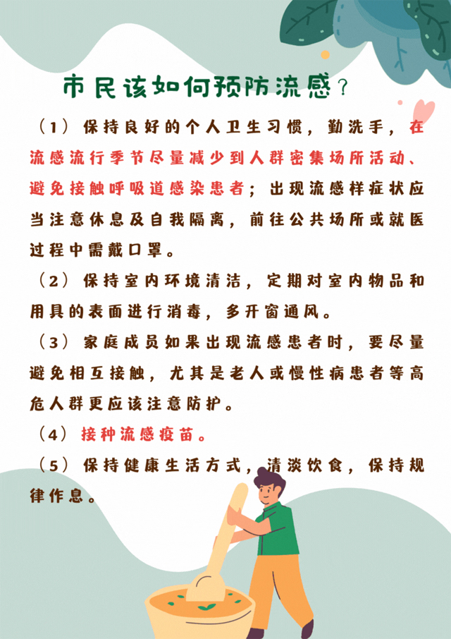 (4)接种流感疫苗是预防流感最有效的手段,可降低接种者罹患流感和发生严重并发症的风险。
