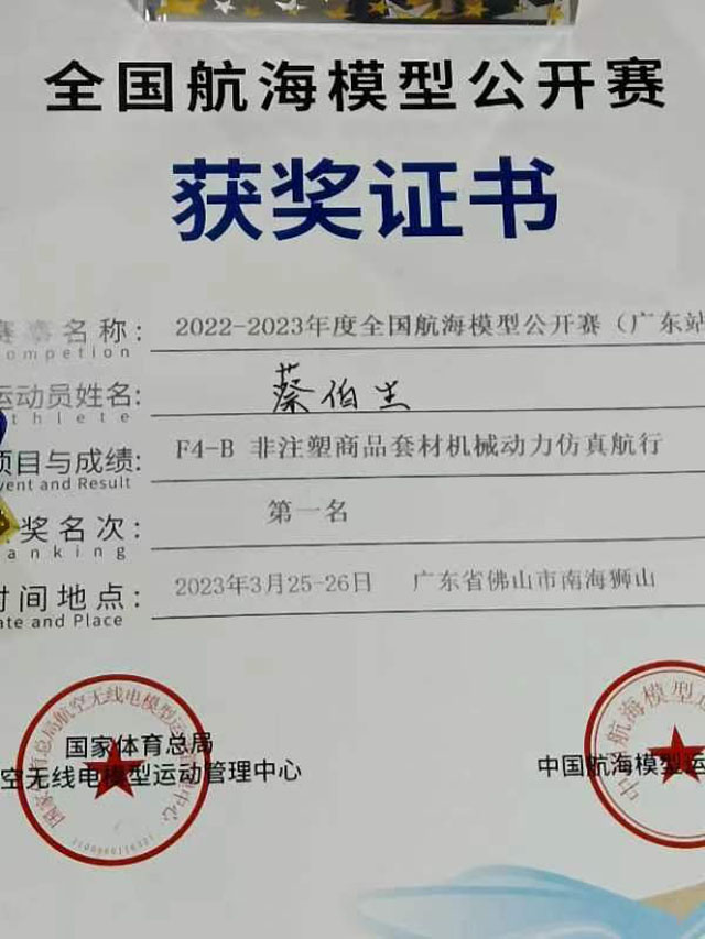 2022~2023年度全国航海模型公开赛(广东站)今年3月25日和4月1日在佛山举行。来自各地24支代表队210名运动员参加个人组和青少年组6个项目的角逐。据悉,这是根据国家体育总局2023年竞赛工作计划,首次在佛山举办的高级别航海模型公开赛。佛山籍运动员蔡伯生是所有参赛运动员中的年龄最大的选手。他以七旬高龄用自行精心制作的导弹舰模型参赛,获得F4–B 非注塑商品套材机械动力仿真航行项目第一名。他的成绩让不少参赛运动员羡慕不已。