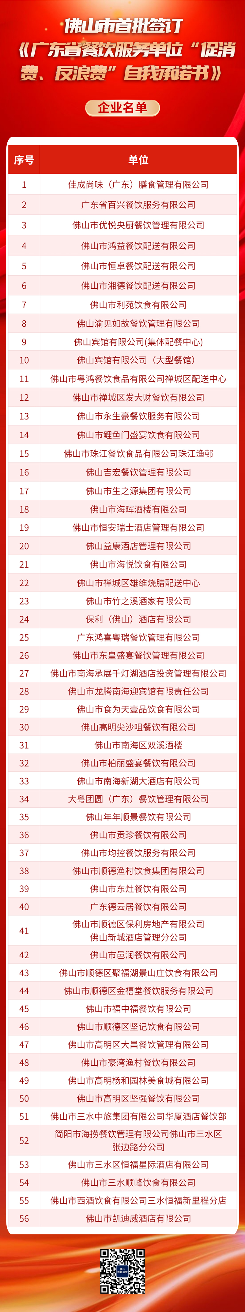 佛山市首批签订《广东省餐饮服务单位“促消费、反浪费”自我承诺书》企业名单: