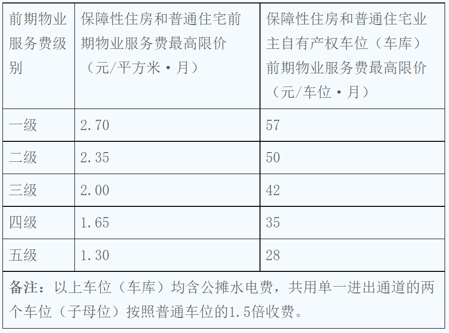 调整为按数量计收后,结合佛山现行普通住宅前期物业服务收费指导价标准的五个级别,明确对应保障性住房和普通住宅业主自有产权车位(车库)前期物业收费最高限价分别为57元/车位·月、50元/车位·月、42元/车位·月、35元/车位·月、28元/车位·月。该最高限价已包含了相应的公摊水电费。对共用单一进出通道的两个标准泊位(子母位)按照对应普通车位的1.5倍计收。人防车位可参照执行。