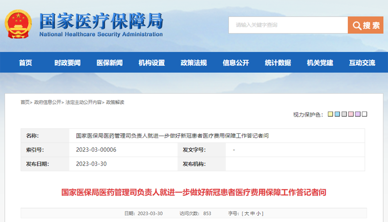 此外,国家医保局官网还发布了《国家医保局医药管理司负责人就进一步做好新冠患者医疗费用保障工作答记者问》。