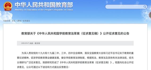 教育部7日起就《中华人民共和国学前教育法草案(征求意见稿)》(以下简称《征求意见稿》)公开征求意见。《征求意见稿》明确,幼儿园不得教授小学阶段的教育内容,不得开展违背学前儿童身心发展规律的活动。