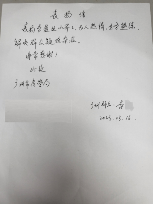 同日,市民李先生因个人诉讼需要来窗口查册。当值工作人员劳盛业同志热情服务、耐心解答,积极为其解决难题。李先生十分感动,现场要求提供纸笔写表扬信,点名表扬劳盛业同志的服务热情、专业。