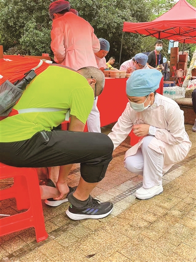 截至1日17时,医疗保障人员累计处理抽筋、表皮外伤、关节肌肉酸痛、倒地、晕厥等情况1786人次,为参加徒步的市民提供了周到暖心的医疗救护服务。