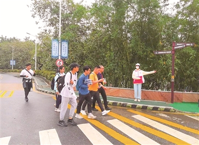 来自佛山科学技术学院的徐斐煌在沙口水闸附近的路口站岗。“我们主要是为大家指引前进的方向,有车要通过路口的时候协助指挥交通,同时也提供相关的咨询服务。” 徐斐煌介绍,徒步开始前,他参加了相关的培训,自己也上网看了一些徒步相关的知识,以备不时之需。