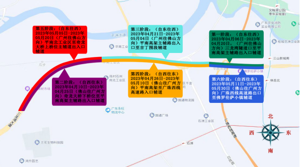 第三阶段 :计划2023年4月21日-2023年5月04日,完成(广州往佛山方向)平南高架主辅路出入口至吉丁围段辅道的沥青罩面、路面基层病害处理、标线划设等改造工作。