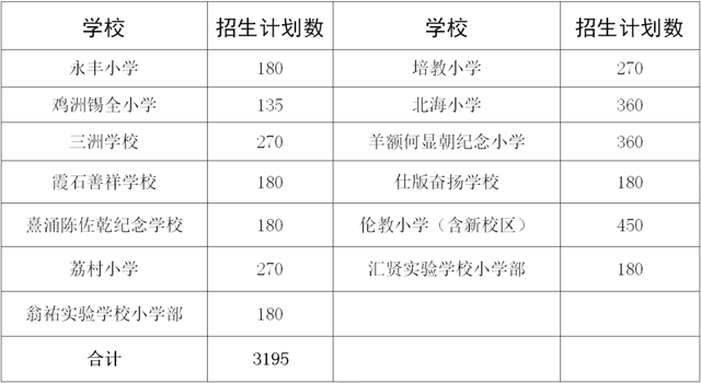 五、翁祐实验学校小学部:面向全街道户籍适龄儿童招生,学位根据各村(社区)户籍生人数分配名额如下:常教95人、仕版10人、羊额7人、新塘5人、荔村17人、熹涌6人、霞石8人、三洲17人、鸡洲6人、永丰9人;