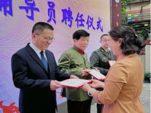 为进一步加强青少年思想道德建设,充分发挥校外辅导员的积极作用。活动伊始,芦荻西小学举行校外辅导员聘任仪式,聘任荔湾区司法局金花司法所所长银欣欣同志,金花街道公共服务办公室副主任、武装部干事陈晓强同志以及曾接受毛主席、周总理等中央首长的接见的退役军人梁炳麟同志作为学校校外辅导员。学校为三位校外辅导员颁发聘书,希望校外辅导员能利用好社会资源和自身优势多组织活动,推动校内校外课堂相结合,为学校的青少年思政增添强劲力量,学生代表为三位系上鲜艳的红领巾,表达来自孩子们的崇高敬意。