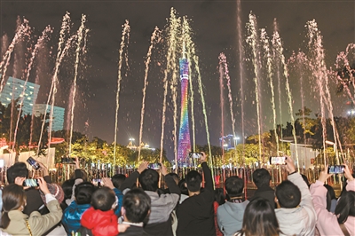 夜晚,花城广场上的音乐喷泉表演美轮美奂,吸引了许多市民驻足