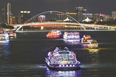 春日的广州凉爽舒适,游客乘船夜游珠江,饱览两岸旖旎的风光