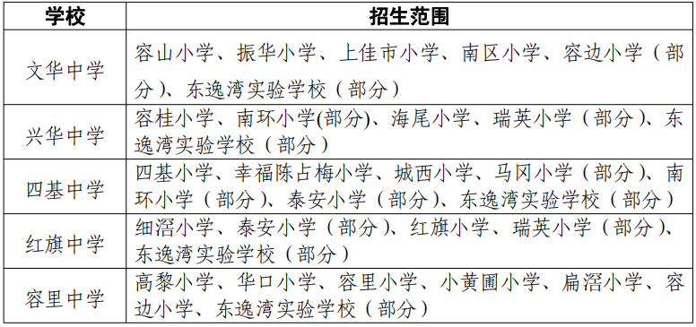 根据招生计划,文华中学、兴华中学、四基中学、红旗中学、容里中学招收容桂户籍生的招生范围如下: