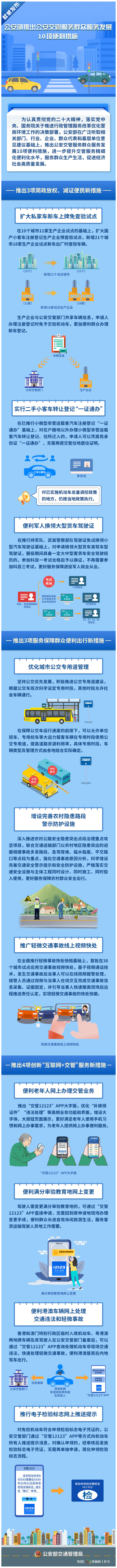 10项新措施分为深化减证便民、服务群众出行、创新“互联网+交管”服务等3个方面,涵盖车驾管办牌办证、城市交通秩序、事故和违法处理、驾驶人教育审验和农村交通安全管理等。