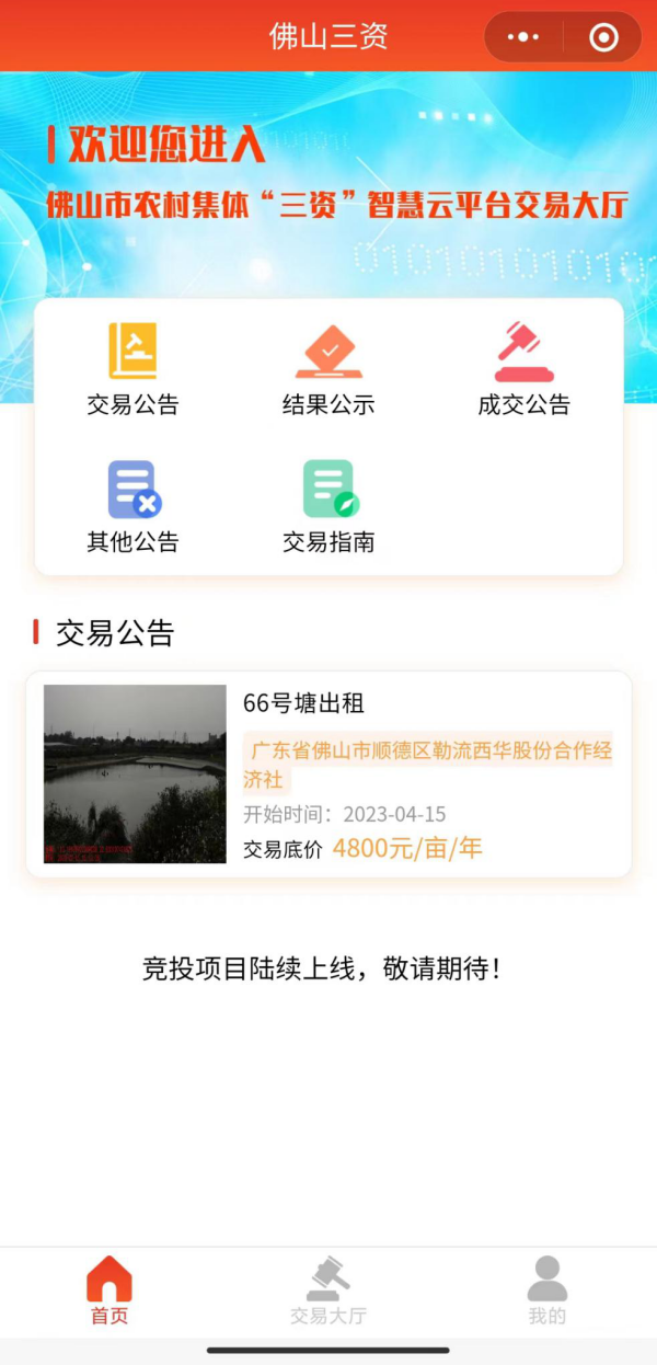 佛山市农村集体资产“三资”智慧云平台可让意向竞投者足不出户就了解到竞投信息,参与到网上竞投,轻松掌握关注项目动态,大大减少时间和空间成本,为用户提供轻松、便捷的交易体验。