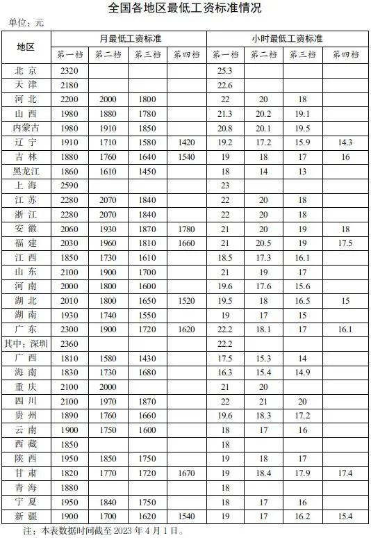 在月最低工资标准方面,上海月最低工资标准达到2590元,这一水平位居全国第一。其次是深圳,月最低工资标准达到2360元。北京排第三,月最低工资标准达到2320元。广东(除深圳外)排第四,第一档月最低工资标准为2300元。