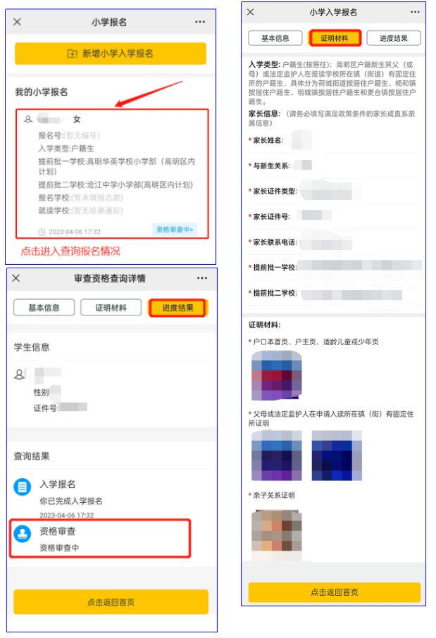 在“小学报名”或“初中报名”页面中,点击新生报名信息,即可查询当前报名记录(报名信息、证明材料、进度结果)。