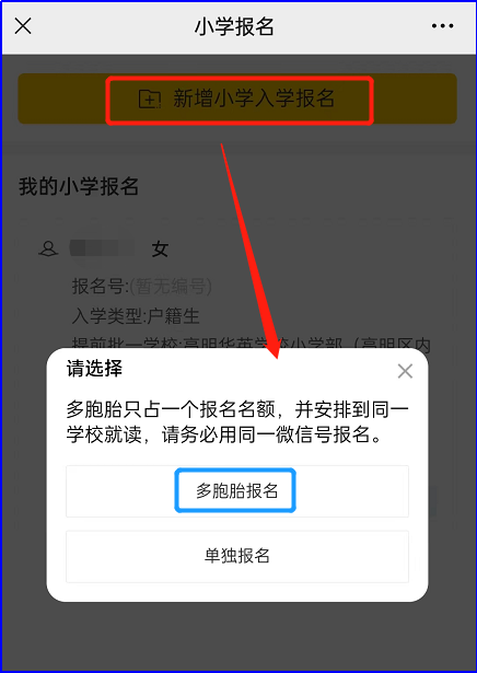 点击“新增小学入学报名”或“新增初中入学报名”,如果是多胞胎,请选择“多胞胎报名”,如需帮他人的孩子报名,请选择“单独报名”,再按页面要求填写报名信息。