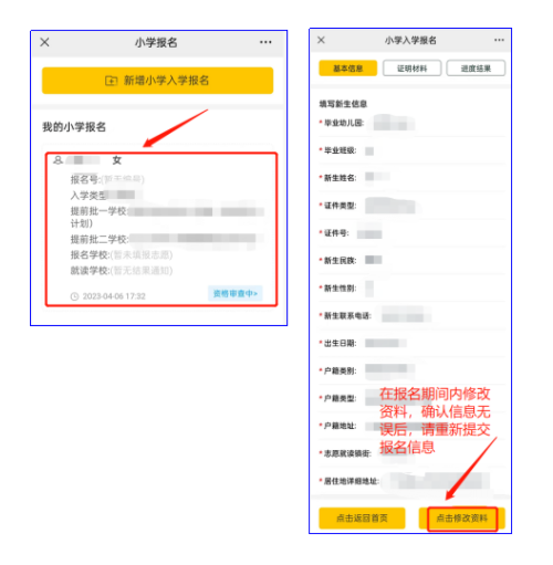 家长如若发现报名信息填写有误,可在小学或初中报名页面中,点击报名信息——点击“修改资料”——修改信息并确认无误后即可重新提交。