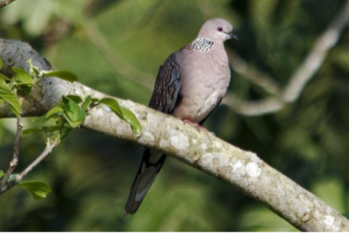 鸠鸽科,珠颈斑鸠属,陆禽。珠颈斑鸠体色多为灰褐色,因为后颈下部至颈侧的黑色中,常缀有白色珍珠状斑点(成鸟有,幼鸟没有),因此得名。经常出现于平地至低海拔平原、丘陵地带,城市中的校园、公园、行道树林等地方。