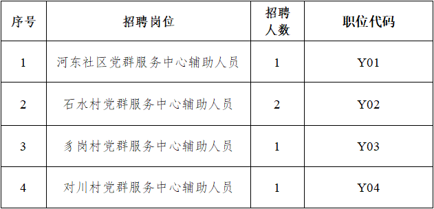 本次公开招聘村(社区)党群服务中心辅助人员5名,具体招聘岗位如下: