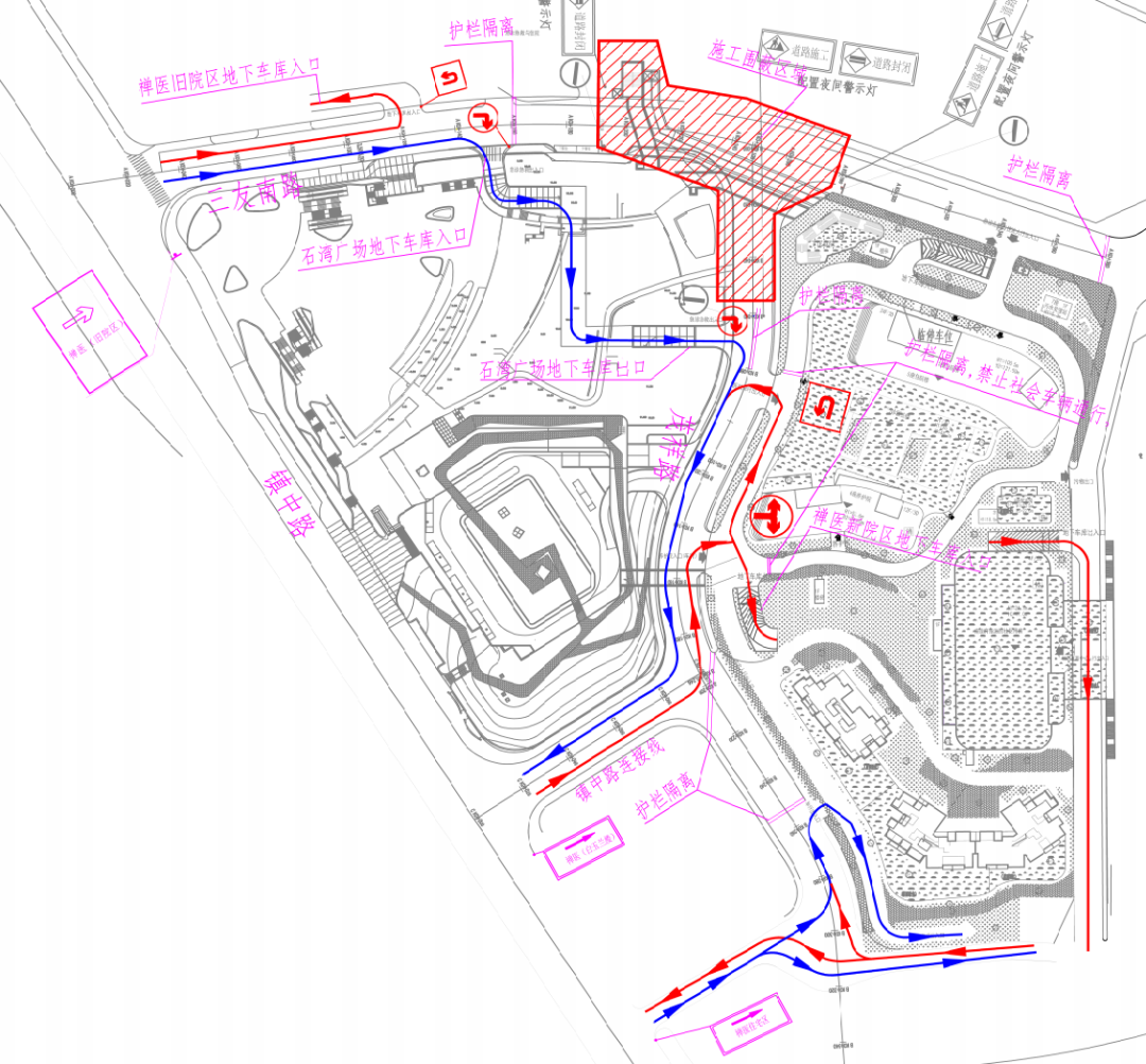 1、去往禅医旧院区地下停车场:车辆可从镇中路(单行)进入三友南路按指示驶入P1停车场。