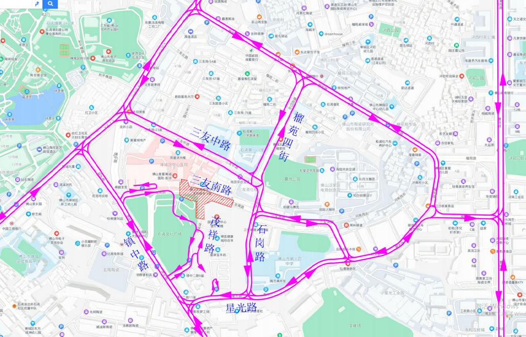2、去往禅医旧院区(只上落,不停放):车辆可从镇中路(单行)进入三友南路(临时上落),经石湾广场地下停车场入口处往出口处沿茂祥路(双行)往南驶出。