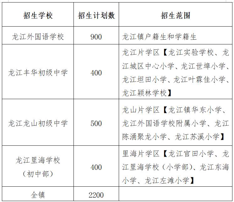(一)实行全镇大学区与分片学区招生相结合,其中龙江外国语学校面向全镇大学区招生,丰华初级中学、龙山初级中学、里海学校(初中部)面向对应学区招生。
