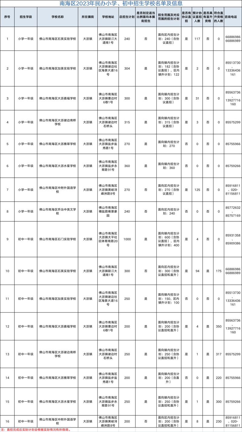 2023年南海区具有直升招生资格的学校名单共23间,其中大沥有6间,详细信息请看下表: