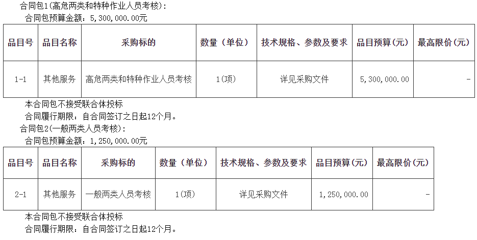 合同包1(高危两类和特种作业人员考核)特定资格要求如下: