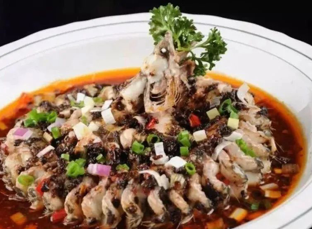 豉汁盘龙鳝是广东地区特色传统名菜,将白鳝宰净切成连串不断的段,盘于盘中,用豉汁等作料拌匀,蒸熟而成。这个摆盘造型使大鳝昂首挺立,焕发英姿,犹如向敌军问师宣战般霸气无比。肉质爽滑,肉味鲜美,有浓郁的豉汁味及芳香。