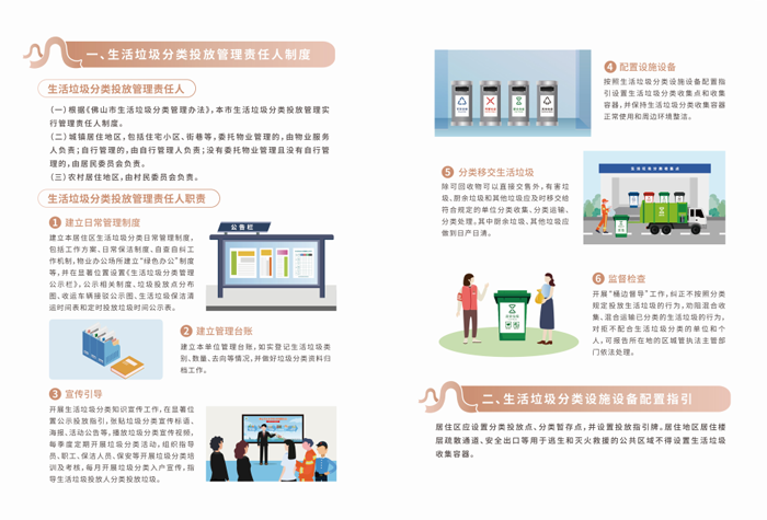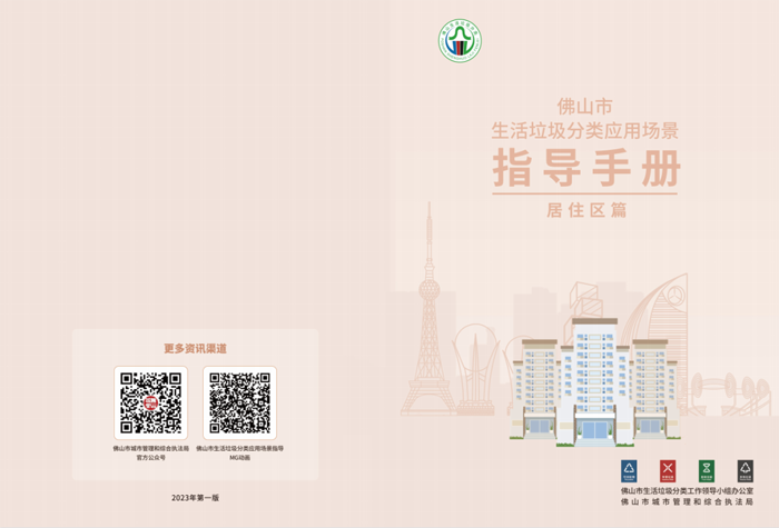 在《佛山市生活垃圾分类管理办法》正式实施一周年之际,为更好推进全市生活垃圾分类工作开展,市垃圾分类办制作了《佛山市生活垃圾分类应用场景指导手册》,将日常的生活垃圾产生源单位分为居住区、机关企事业单位、公共交通场站、文化及体育场馆、大型商超、公园旅游景区、学校、医疗机构、餐饮娱乐场所、酒店宾馆、集贸市场及工业园区合共12个应用场景,以图文指导与视频教学结合的形式,生动直观地指导产生源单位做好生活垃圾分类工作。