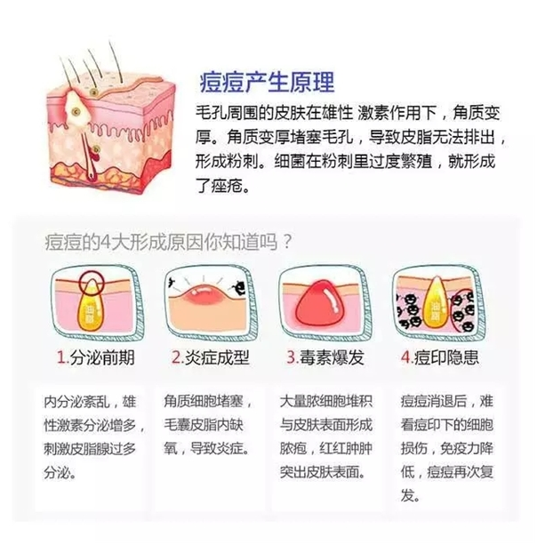 1.皮脂过量分泌,雄激素水平的升高可促进皮脂发育腺发育,分泌大量皮脂,堵塞毛孔。