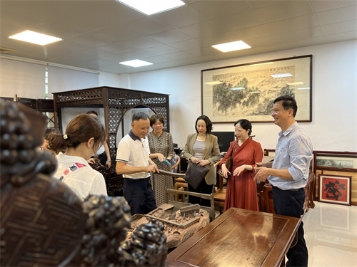调研组一行来到省级非遗传承人唐锦全木雕工作室,先后参观了木雕工作室的家具作品、木雕工艺品、文创作品以及各种木材原料与木雕工具,实地了解市级非遗项目“广式木雕”的制作工艺流程。在座谈会上,调研组对广州木雕非遗项目的发展情况与市场前景,如何探索产业化发展方向,如何将木雕等非遗项目进行跨界融合创新,开拓非遗项目与旅游发展、学术交流等融合发展,从而增强各非遗项目地市场竞争力等,与唐锦全大师进行交流碰撞。唐大师表示,将坚守传承责任,继续拓展广州木雕非遗项目的发展空间,在荔湾非遗集聚区打造新的精品展示区,助力荔湾非遗高质量发展。