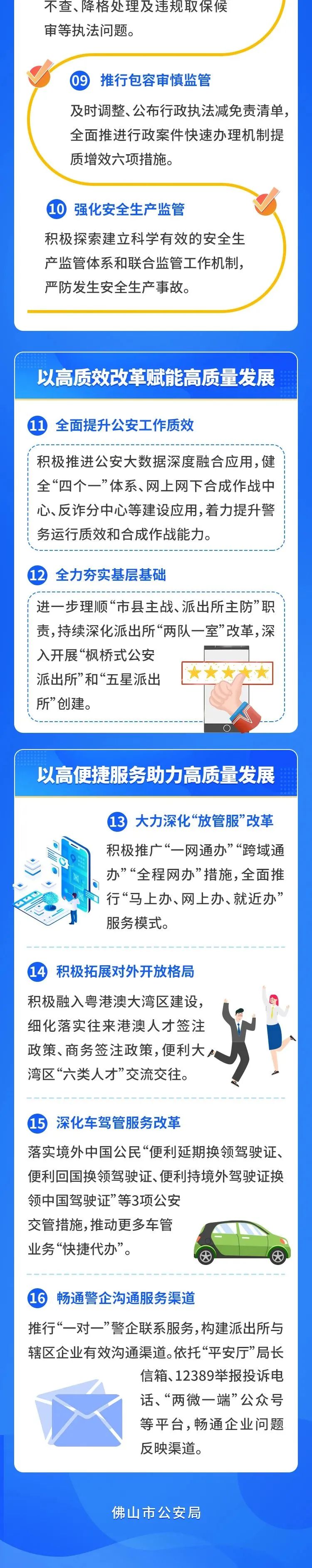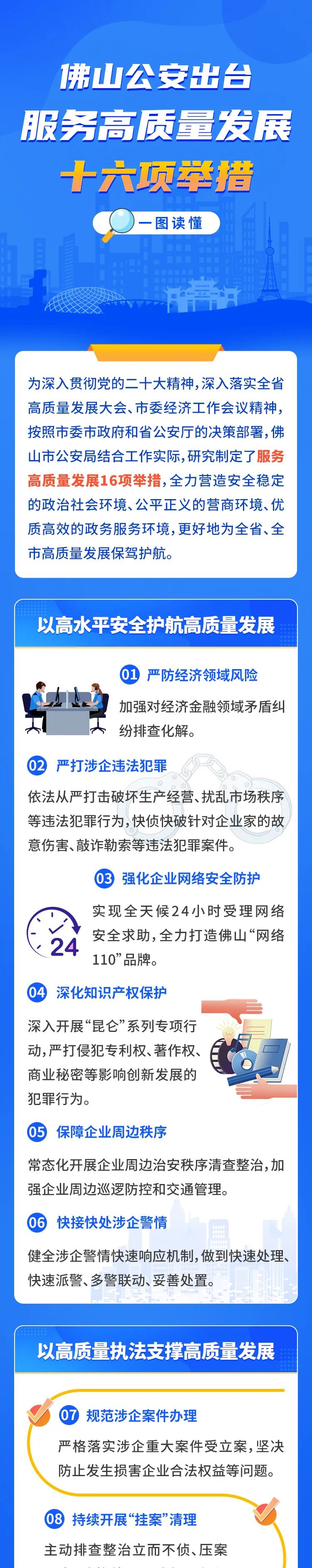 严厉打击涉企违法犯罪,最大力度维护企业和企业家的合法权益;深化推进知识产权保护,重拳整治侵犯专利权等影响创新发展犯罪……为深入贯彻落实全省高质量发展大会、市委经济工作会议精神,日前佛山市公安局出台《佛山市公安机关服务高质量发展十六项举措》,明确将全力营造安全稳定的政治社会环境、公平正义的营商环境、优质高效的政务服务环境,进而更好地为全省、全市高质量发展保驾护航。