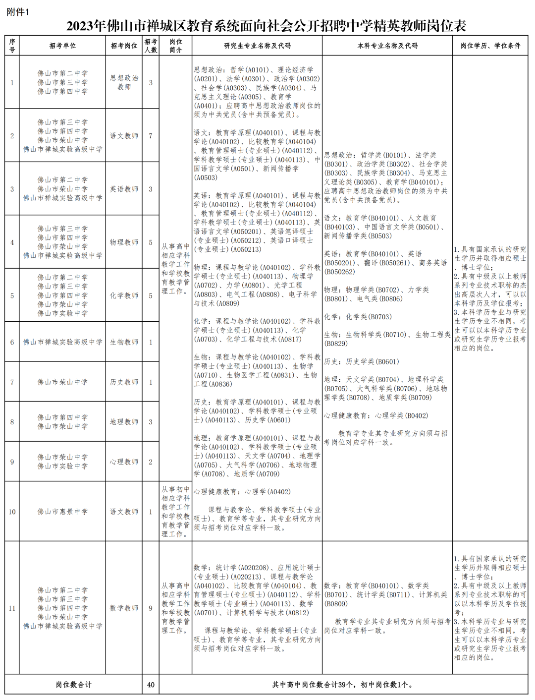 具体要求详见附件1《2023年佛山市禅城区教育系统面向社会公开招聘中学精英教师岗位表》。