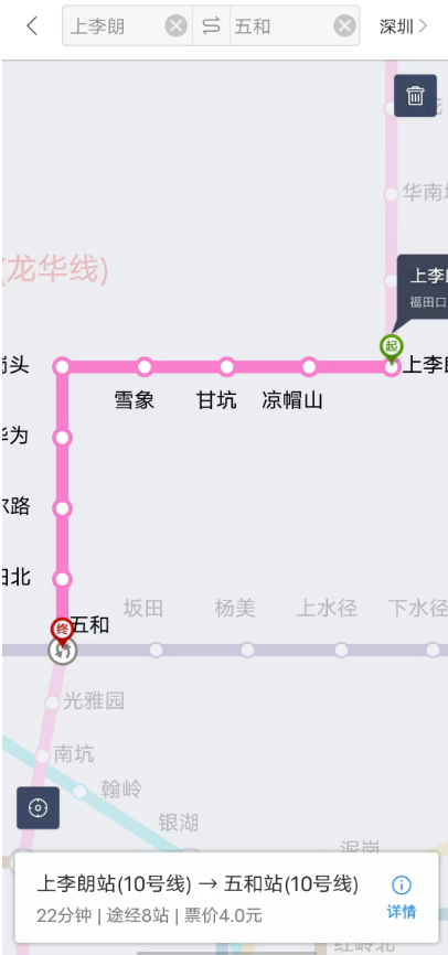 据该网友发布的截图显示,乘车路线为深圳地铁10号线的“上李朗→五和”。该乘车段途经8站,票价4元。