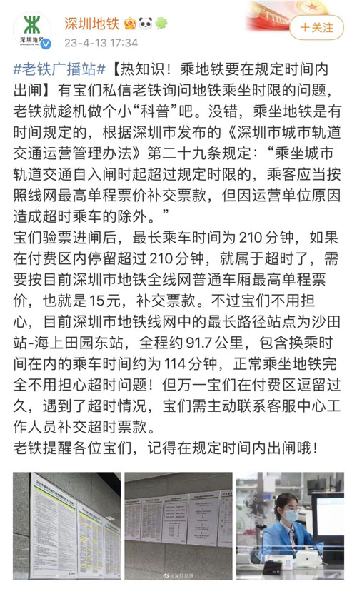 4月13日,深圳地铁官方微博发文提醒,验票进闸后,最长乘车时间为210分钟,即3.5小时,发生超时的情况时,乘客需要按目前深圳市地铁全线网普通车厢最高单程票价15元补交票款。