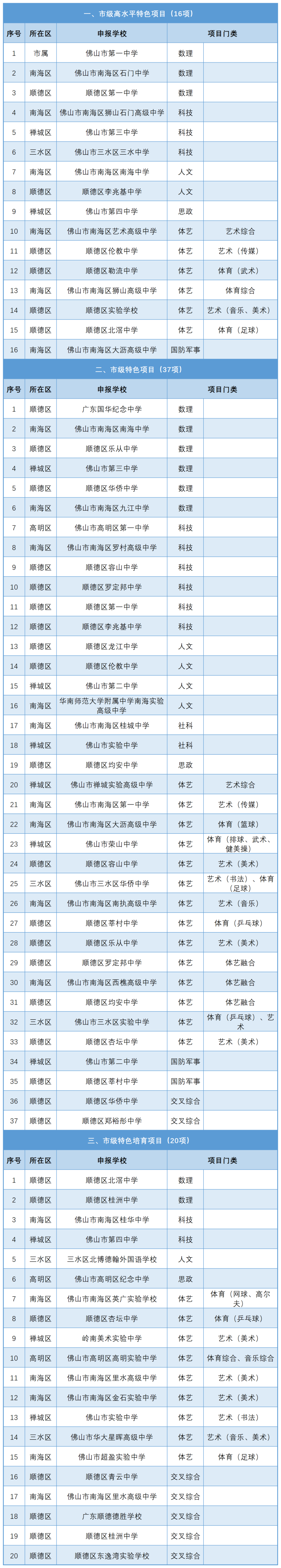 佛山市普通高中多样化有特色发展“双高”行动创建评审结果正在公示。经各普通高中学校自主申报、各区教育局推荐、市教育局组织评审等程序,拟遴选产生创建市级高水平特色项目16个、市级特色项目37个、市级特色培育项目20个。公示期为2023年4月20日至4月25日,共5个工作日。