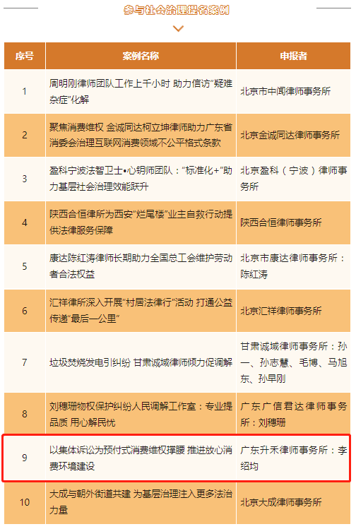 广东升禾律师事务所主任李绍均律师协助佛山市消费者委员会出台了《佛山市消费者委员会支持预付式消费服务纠纷起诉暂行管理办法》(以下简称《办法》),并根据该办法接受佛山消委会指派支持教育培训领域的集体诉讼系列案件,涉及投诉的消费者多达264名,诉前调解及法院判决返还金额约108.42万元。该代理方式为全国首创,代理的案件也是全国首宗支持消费者集体诉讼案件。该系列案件上榜了中国消费者协会《2021年上半年投诉分析之11大投诉热点及典型案例》、入围由中国工商出版社主办的第四届《市场监管领域社会共治优秀案例》。